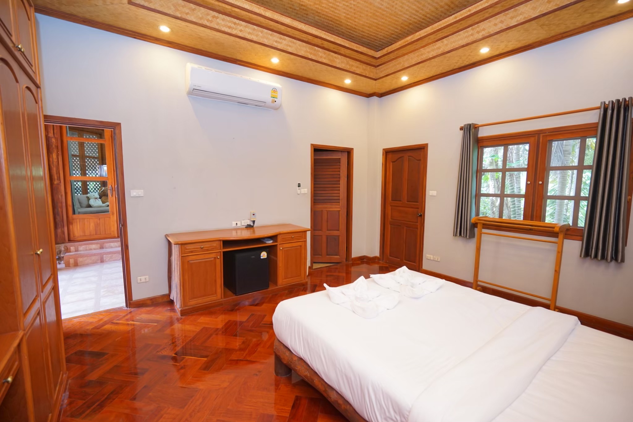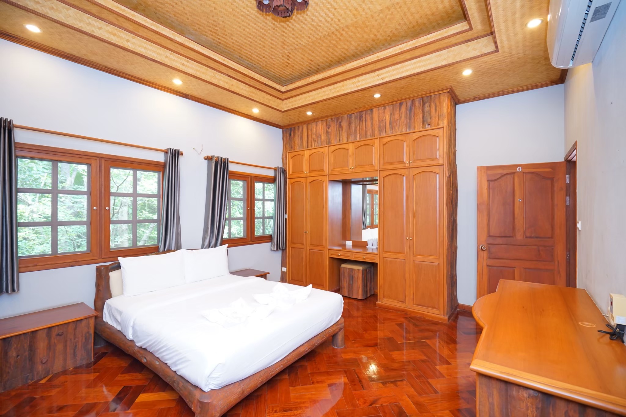 ห้องนอนหลักที่กว้างขวางที่สุดใน "บ้านพ่อ" ออกแบบมาเพื่อการพักผ่อนอย่างแท้จริง พร้อมเตียงขนาดใหญ่และวิวสวนส่วนตัวที่เงียบสงบ